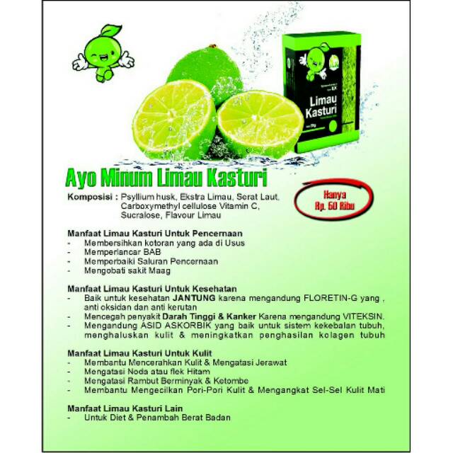 TURUNKAN BERAT BADAN Perahan limau kasturi dicampur dengan teh tanpa gula dan diminum setiap hari. Cara nak tanam pun senang guna keratan batang dan boleh tanam dalam pasu saja. Limau nipis dan purut airnya berwarna hijau cerah dan jernih sedangkan limau nipis kasturi hijau kekuningan.